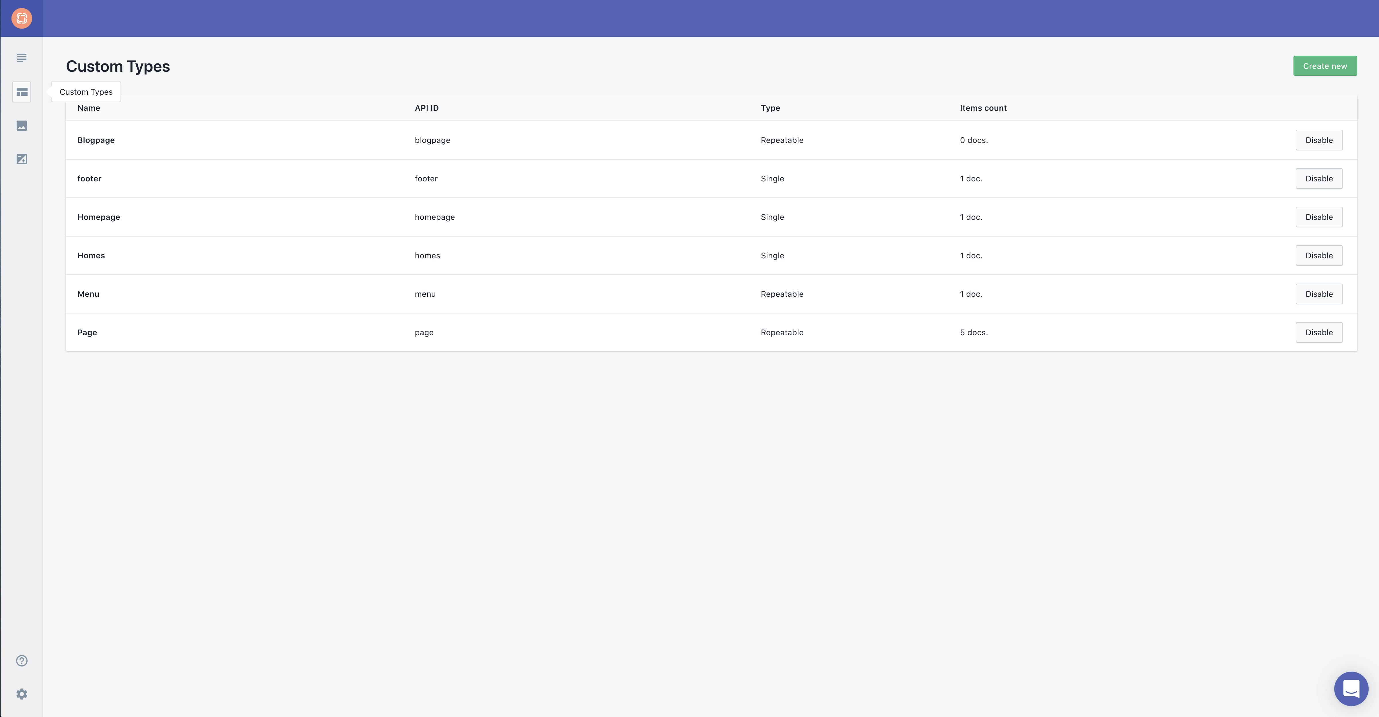 - Click on Custom Types on the left side menu bar